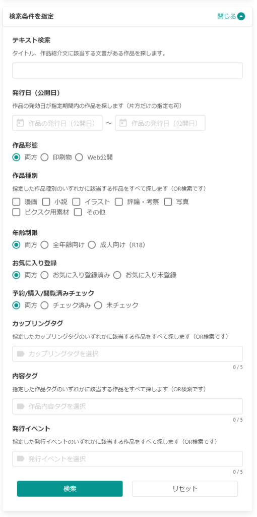 作者の方がどのようにタグ付けをしているかに依存してしまいますが「〇〇というカップリングの本だけ絞り込みたい」「〇〇という内容が含まれる本だけ絞り込みたい」といった探し方が出来ます。
